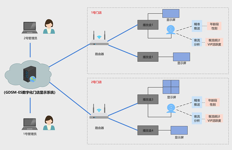 该客户为宁波地区零售门店,在一段时间内,客户发现门店销售额持续下滑,但是不知道原因出在哪里,到底是消费者减少,还是广告推送出现问题,亦或是其他原因,客户没有头绪,ca88科技数据化门店显示系统完美的解决了客户痛点,方案拓扑图如下: