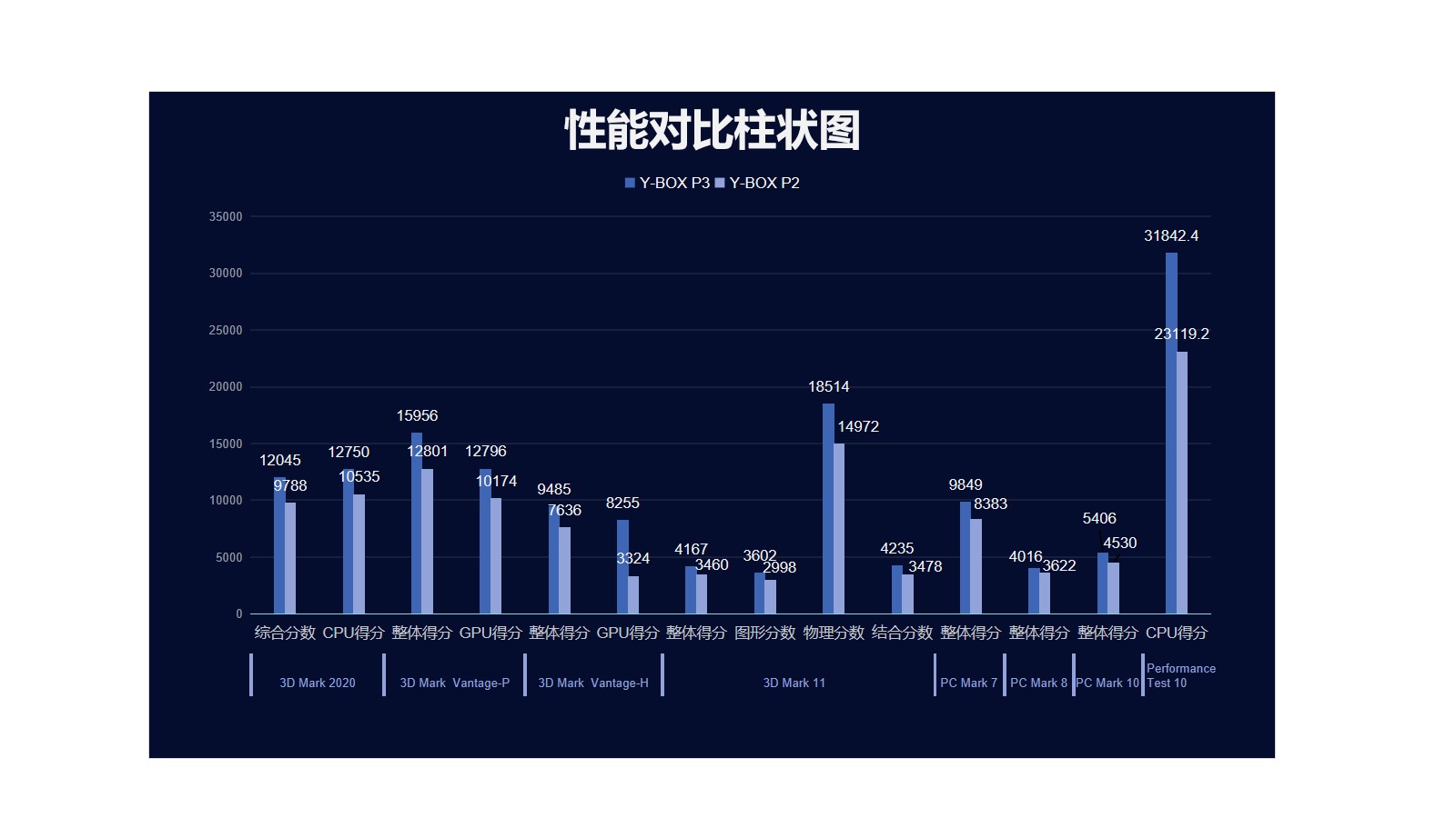 ca88来具体看看各个测试项目的跑分情况,ca88分别用3D Mark、PC Mark以及Performance 10等不同系列不同软件进行跑分,测试项目涵盖显示性能测试、系统性能测试、CPU性能测试等。通过下面的表格及柱状图可以看出,ca88桌面云终端Y-BOX P3的数据在各项性能上都得到了大幅度提升。