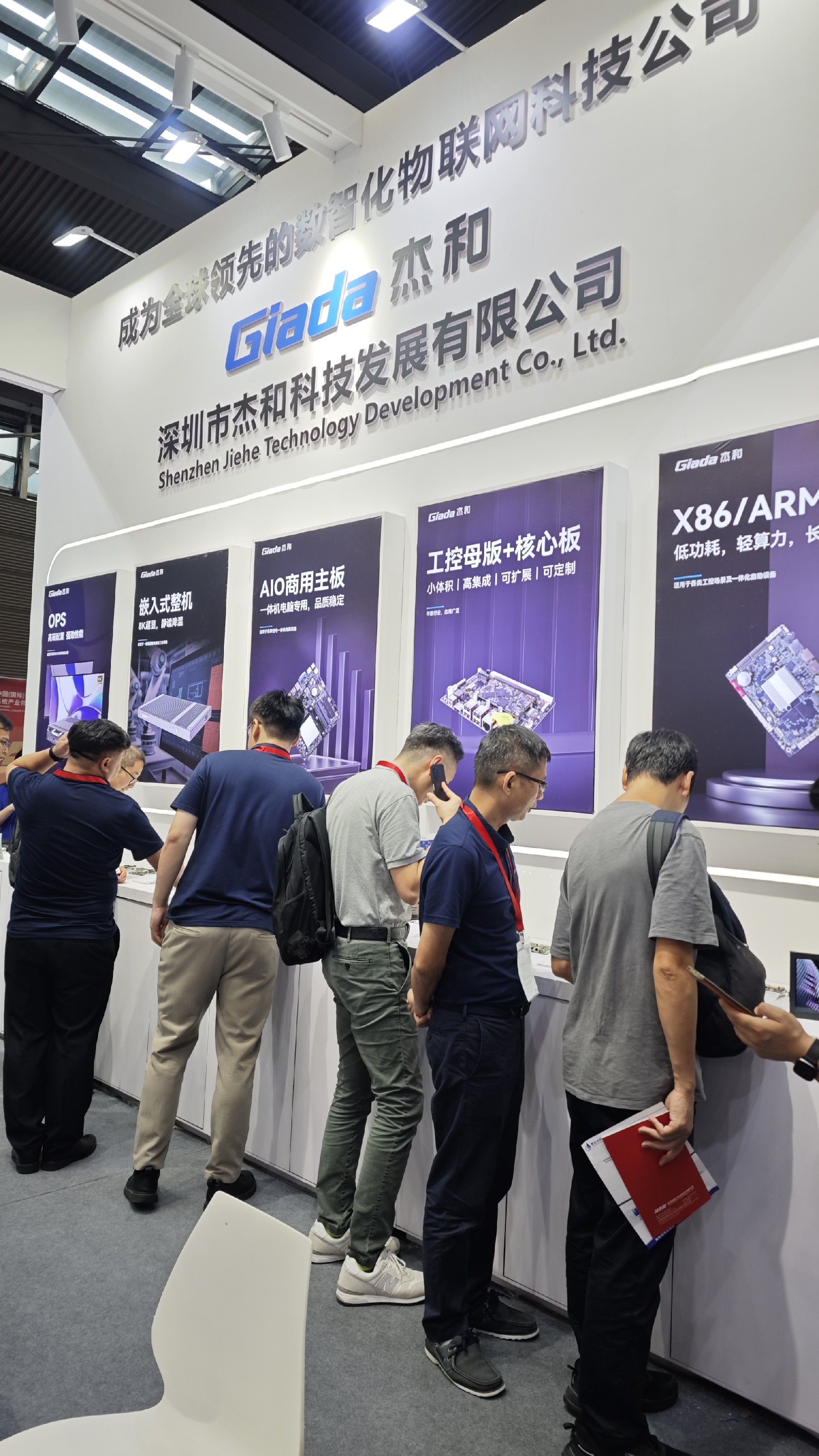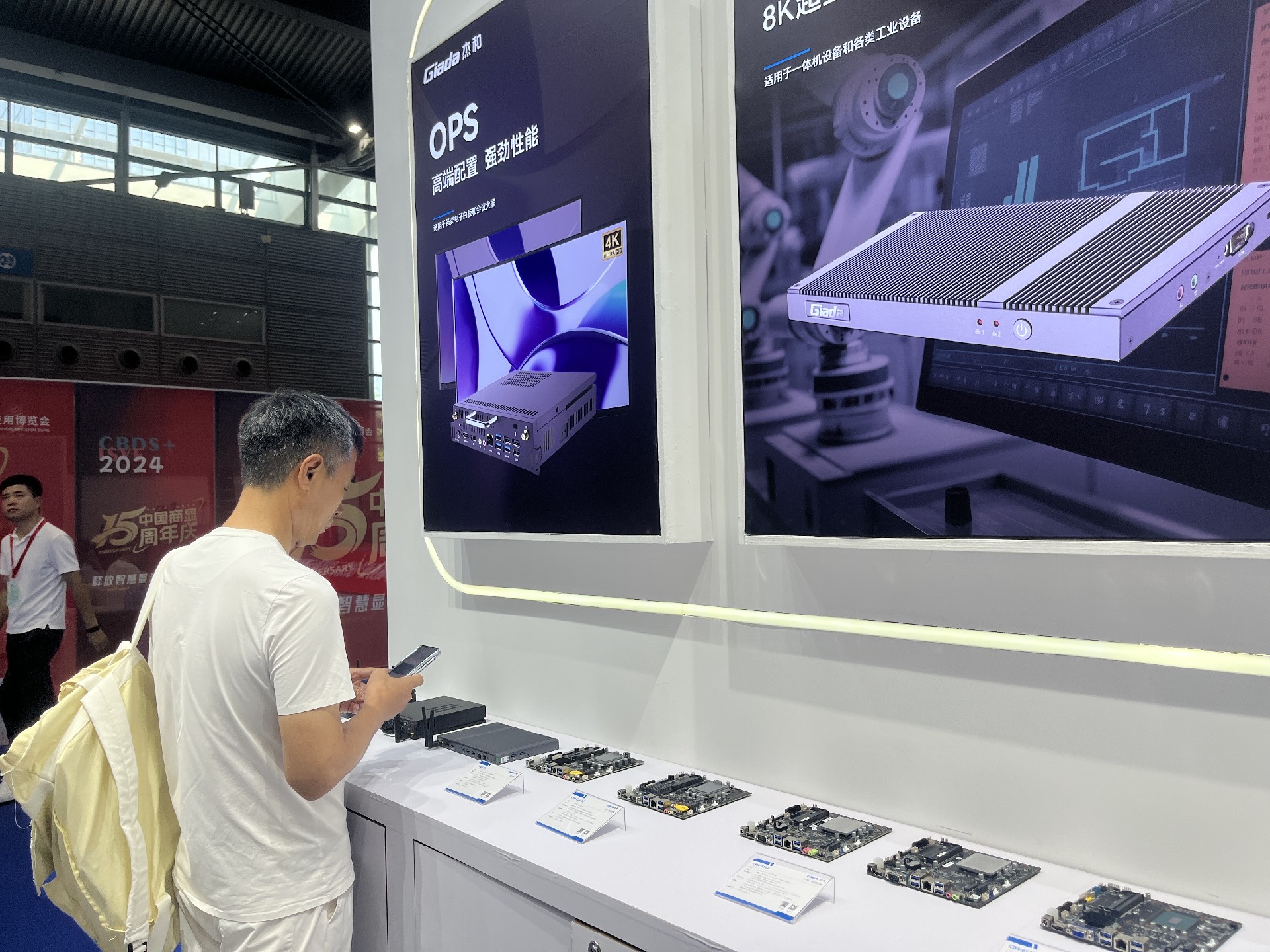ca88科技展位放置在c位的明星产品和最新产品吸引了众多参观者的目光。展台下方整齐排列着公司的产品,包括主板、嵌入式整机、OPS等,这些产品不仅适用于商业展示领域,还广泛应用于工业、制造业和教育业等多个行业。