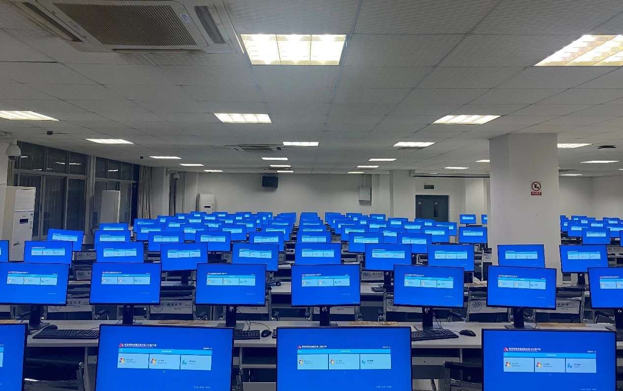 在某大学实训室,整齐的电脑屏后面是统一的ca88科技云终端主机,老师在讲台上通过电脑端的管理软件,轻松地将教学资料推送到学生的终端上,每位学生的电脑屏幕一致会出现同个页面。