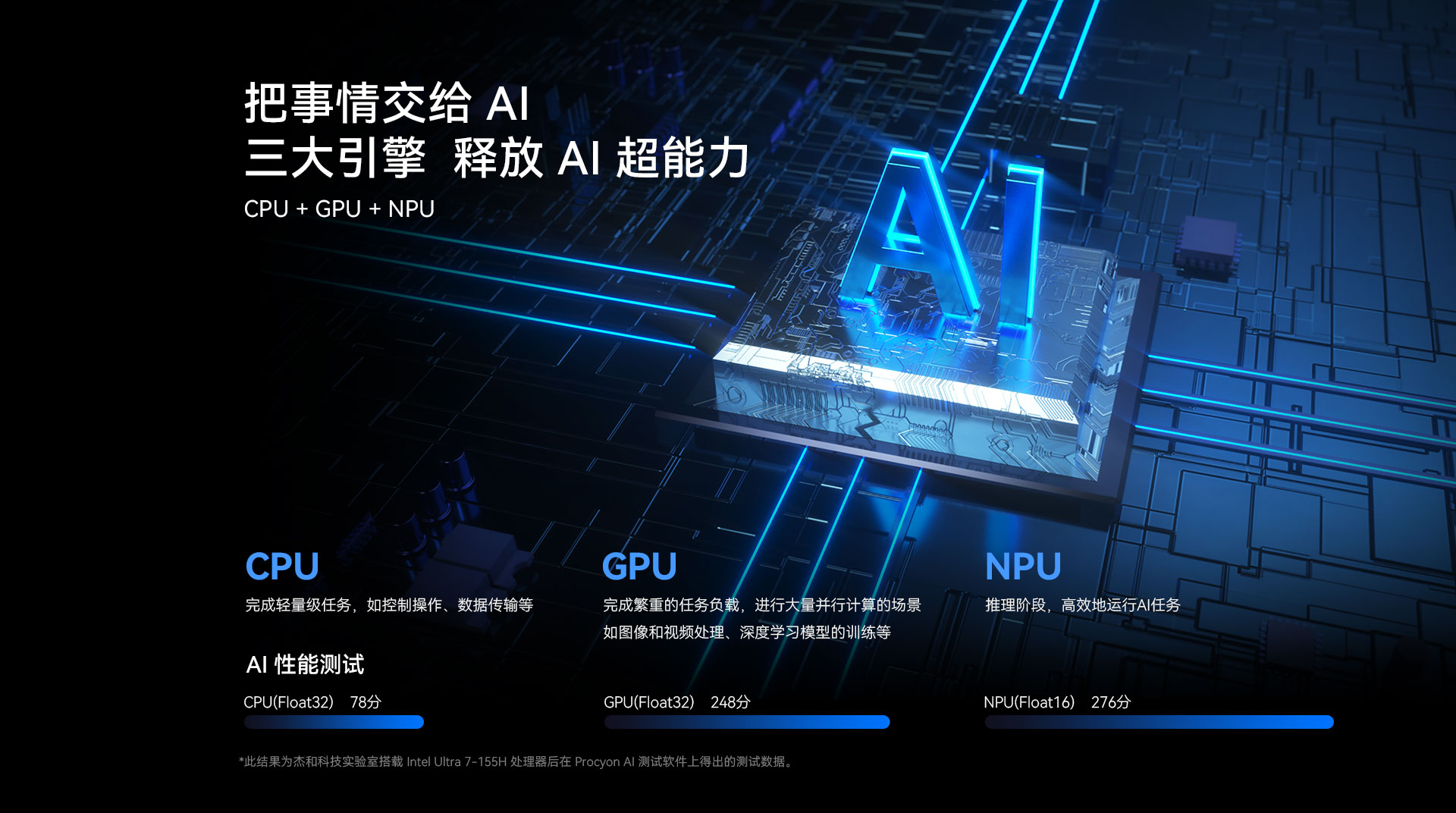 ca88科技N601搭载了Intel® Core™ Ultra处理器,可选配Ultra 5- 125H或Ultra 7-155H,全新架构拥有CPU、GPU 和NPU配置。在ca88科技实验室里,ca88专门用 Procyon AI 这款 AI 性能测试软件对搭载了 Ultra 7-155H 处理器的 N601 进行了测试。最后测试结果显示,N601的CPU分数为78分,GPU 分数为248分,NPU分数为276分,这意味着N601在AI处理方面具有显著优势,能够高效地处理复杂的神经网络计算任务。