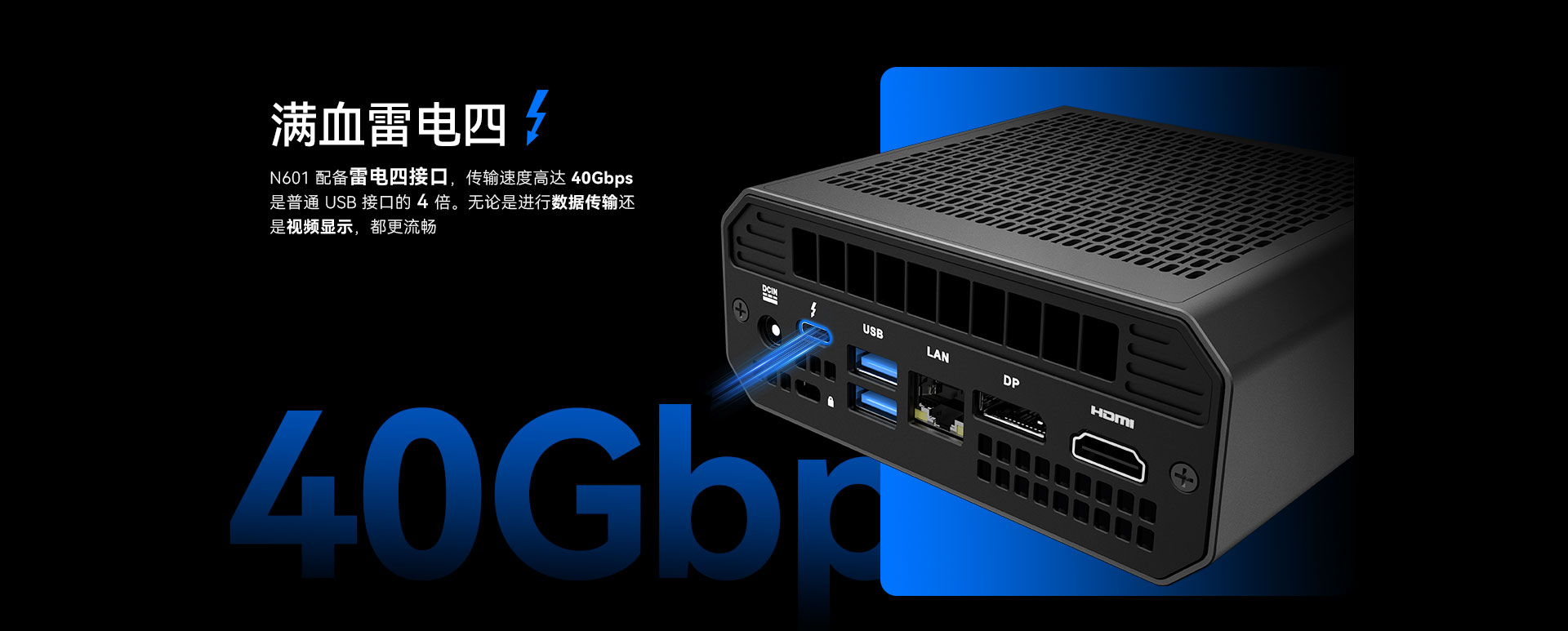 ca88科技N601配备雷电四接口,传输速度高达40Gbps,用户可通过该接口连接2块屏幕。还可通过HDMI2.1接口,DP1.4接口再连接两块屏幕,实现四屏异显。雷电四还可以连接外设,如鼠标、键盘、控制器和耳机等。
