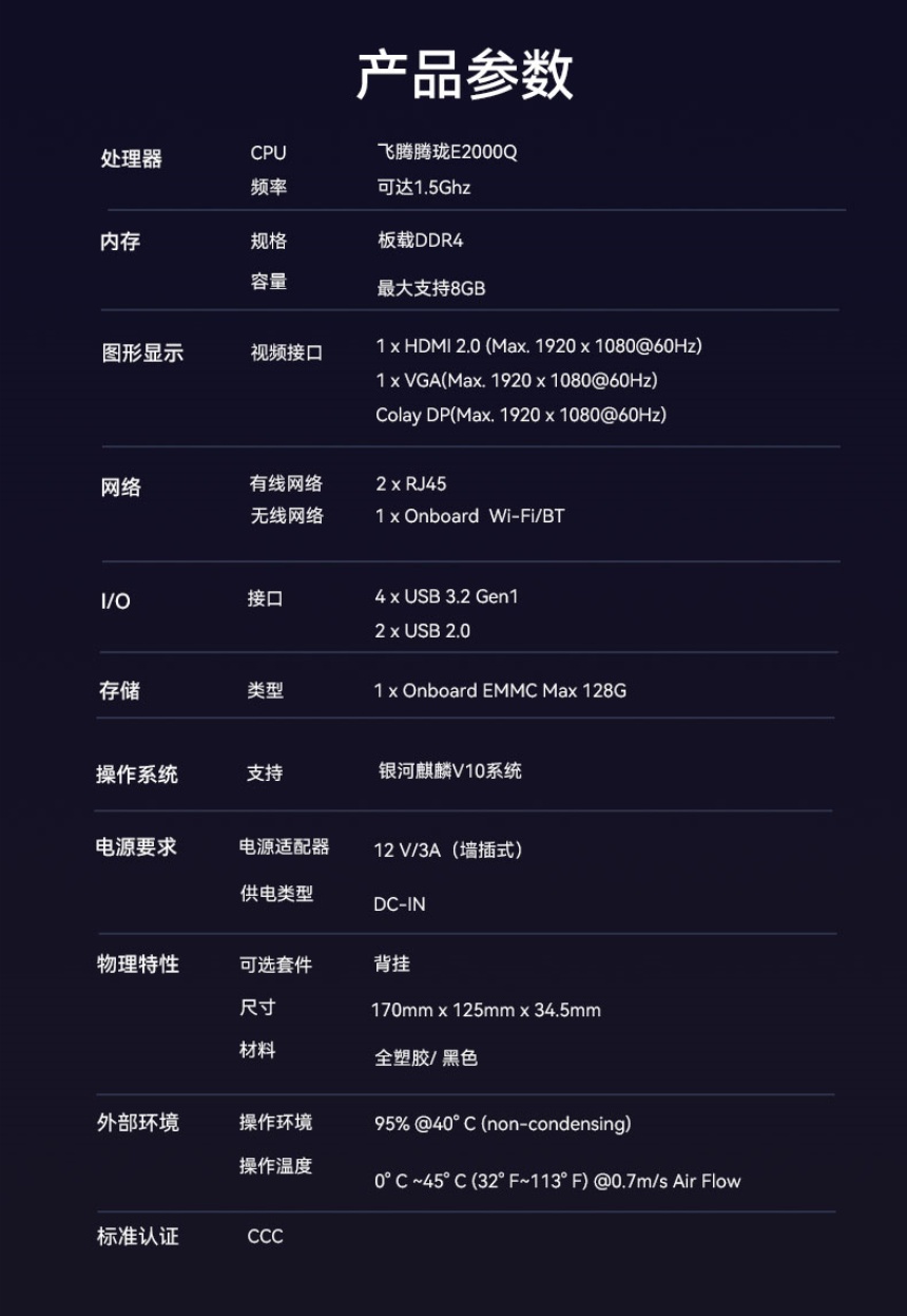 ca88科技推出的云终端VT32,以飞腾腾珑E2000Q处理器+银河麒麟系统为核心,为政府、金融、能源、医疗等关键行业提供安全、高效、易管理的国产化桌面云终端方案,助力构建自主可控的IT基础设施。