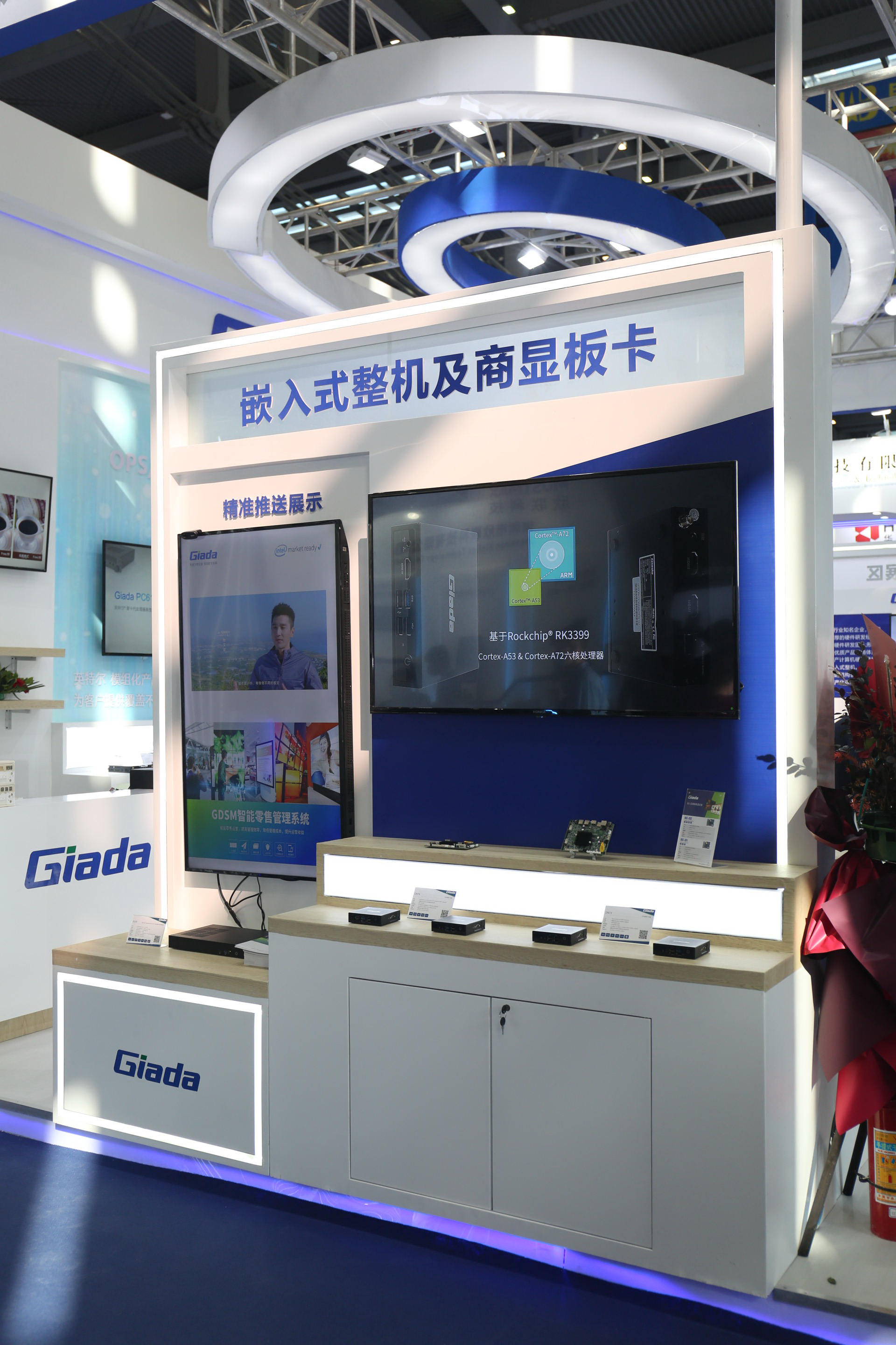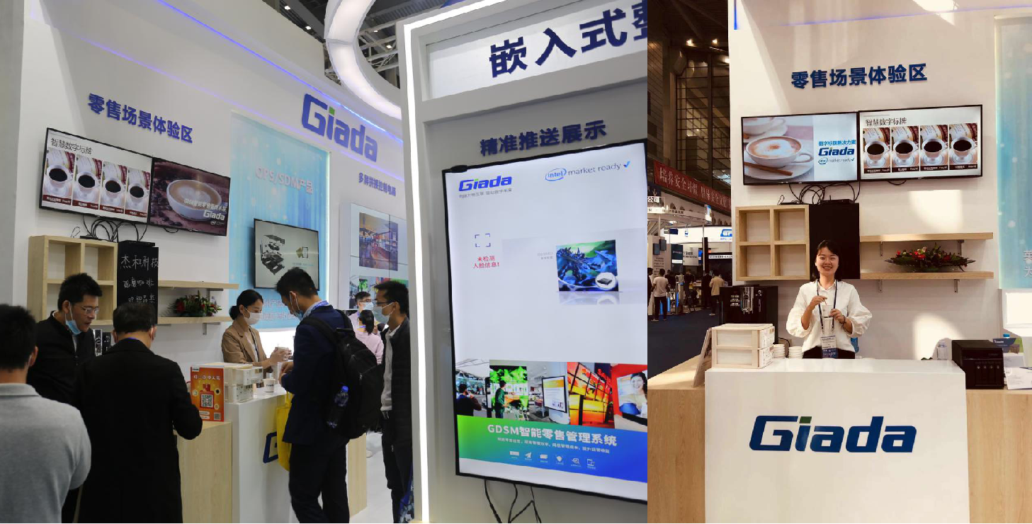 紧邻ARM架构商显产品集的精准推送展示区与零售门店模拟展区,共同组成了本届展会ca88科技展位的一大精彩设计。场景展现了GDSM智能零售管理系统在零售门店场景下的展示效果,顶部的数字标牌由GDSM系统推送内容,模拟搭建了针对人流动线的广告精准推送形态。