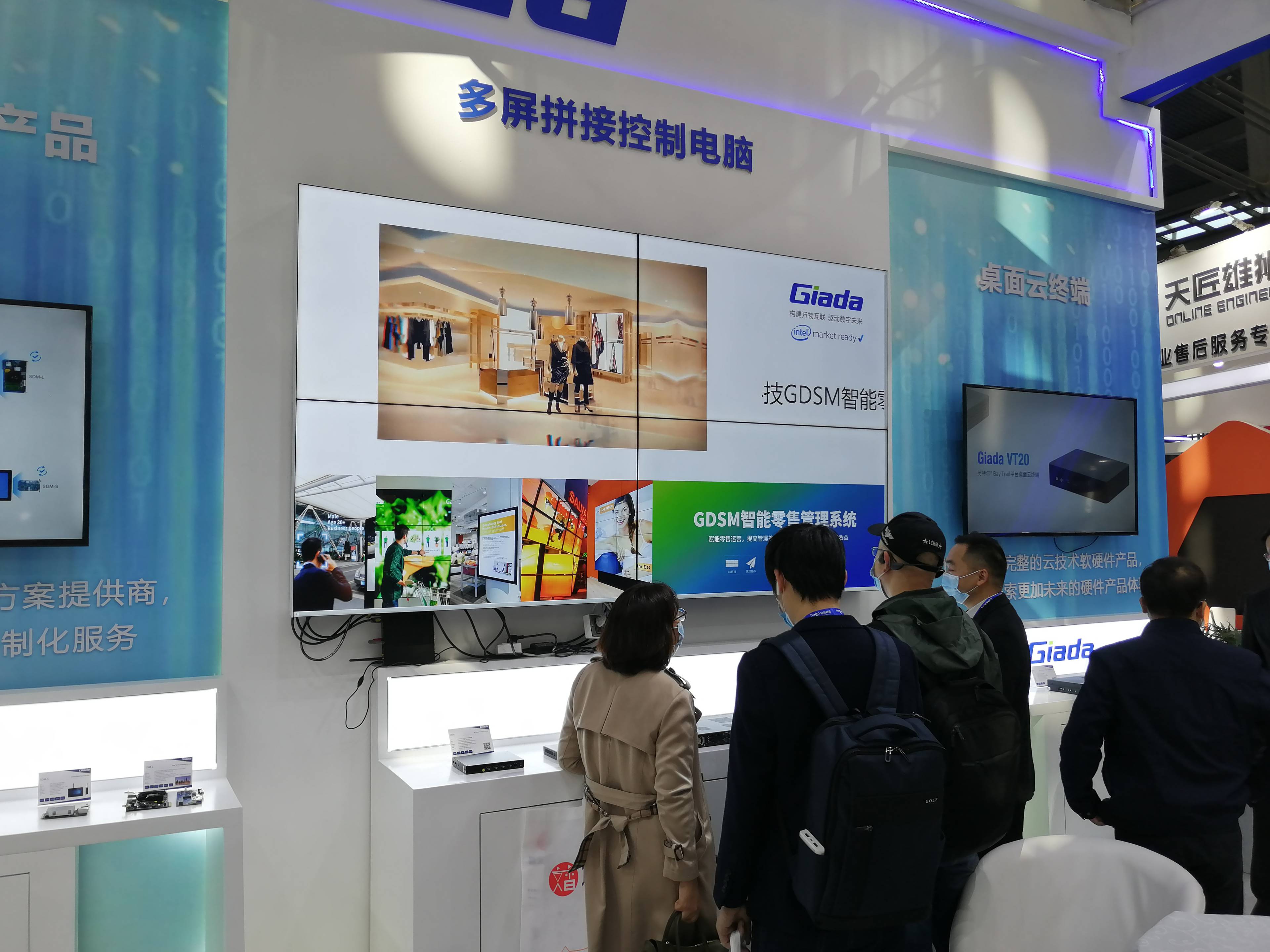 步入ca88科技展位,首先呈现的是ca88科技近年的商用显示ARM产品集和GDSM广告精准推送演示。ca88科技DN系列媒体播放器分别使用了瑞芯微RK3288、RK3328和RK3399三款核心芯片;全部采用116mm*107mm*30mm的紧凑外观设计,轻便灵活;搭载RK3399的DN74媒体播放盒具备双屏4K异显输出能力,DN75在DN74的基础上额外扩展了HDMI-in视频输入接口,支持画中画或投屏显示。ca88科技现场布署的所有单个屏幕都由DN系列媒体播放器作为信号源,GDSM智能零售管理系统下发的广告信息通过后台推送,再现了零售场景下如何管理多个分散布署的广告屏。