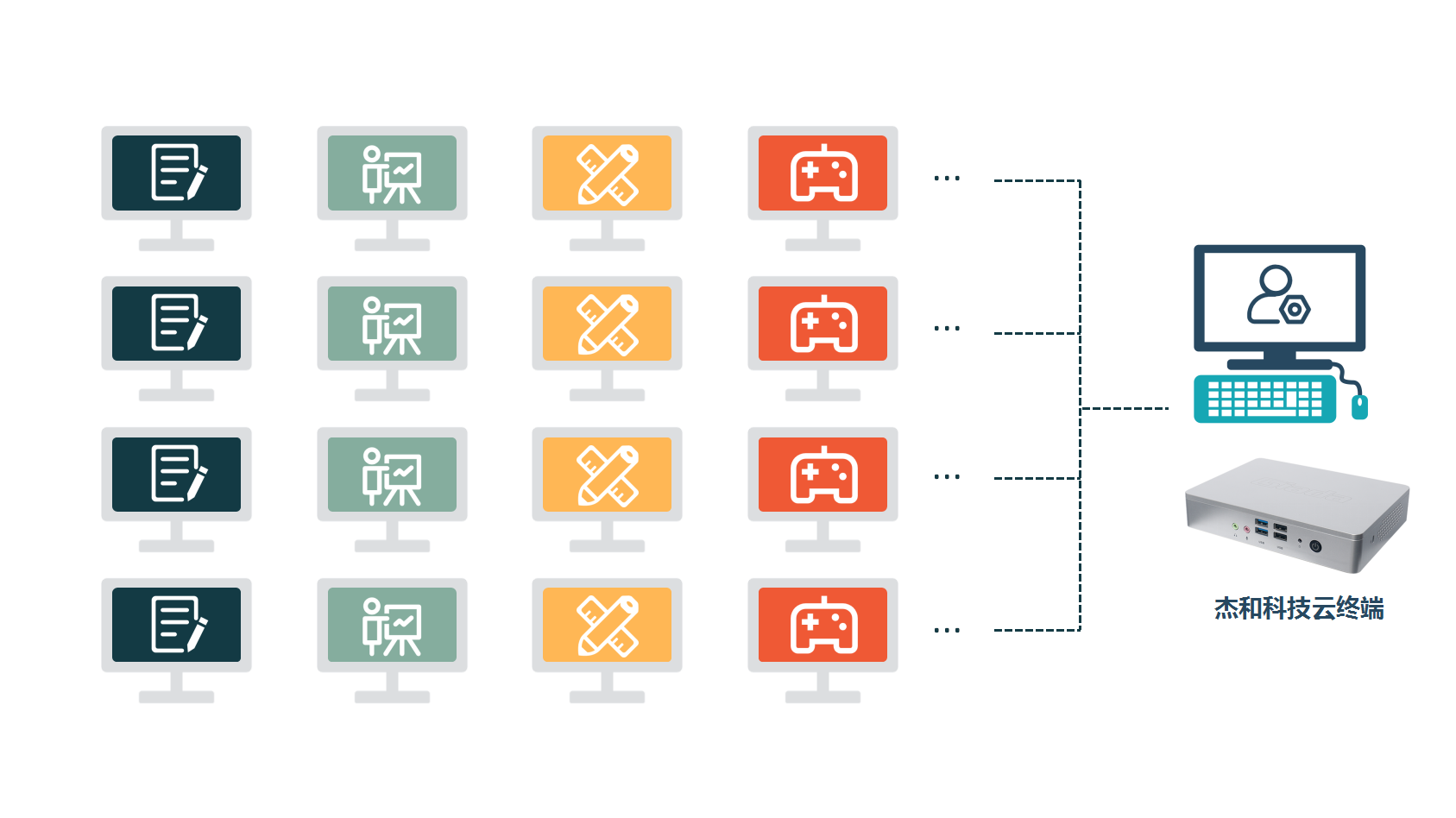 云终端的电脑部署更便捷高效,比如新员工报道,领一台云终端,配上显示器、键盘、鼠标,插上网线就能办公,再也不用经过安装系统、安装程序、拷贝工作所需数据等工作,耗费人力物力。
