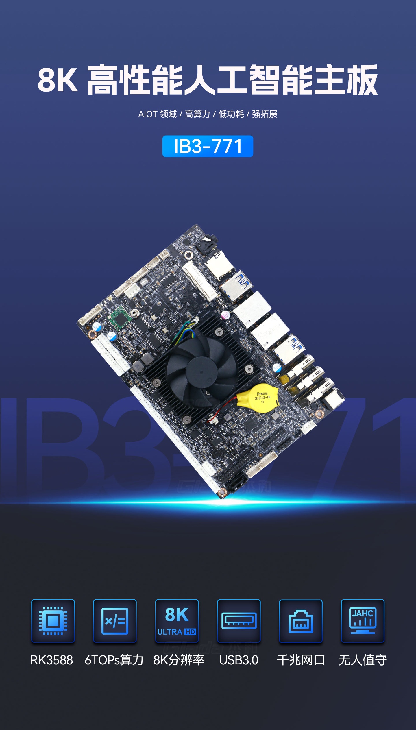 ca88科技IB3-771采用瑞芯微全新旗舰级芯片RK3588,搭载八核64位处理器,集成ARM Mali-G610 MP4 GPU,高算力、低功耗、具备强大的视觉处理能力;性能强悍的RK3588内置AI加速NPU,提供6TOPs算力,支持主流深度学习框架,为各类AIoT应用场景提供更优的性能表现。
