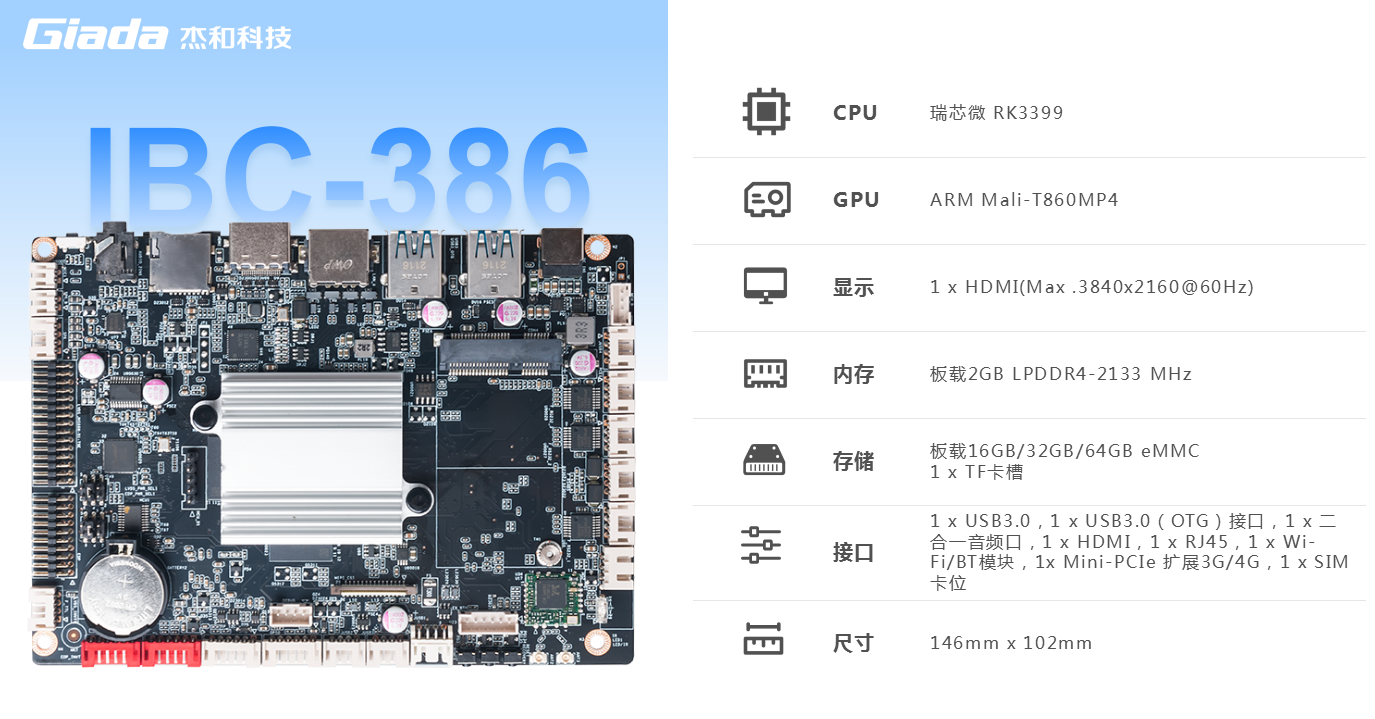 ca88科技IBC-386是一款基于ARM架构的3.5英寸主板,采用瑞芯微RK3399处理器(双Cortex-A72大核+四 Cortex-A53小核)六核 64 位CPU。RK3399作为瑞芯微超级扩展全能型旗舰级芯片,GPU采用四核ARM新一代高端图像处理器Mali-T860MP4,具备高性能、低功耗、强大的视觉处理能力的特点。IBC-386板载2GB LPDDR4-2133 MHz内存,板载16GB/32GB/64GB eMMC,支持1x TF卡槽,多种形式轻松扩展存储容量。