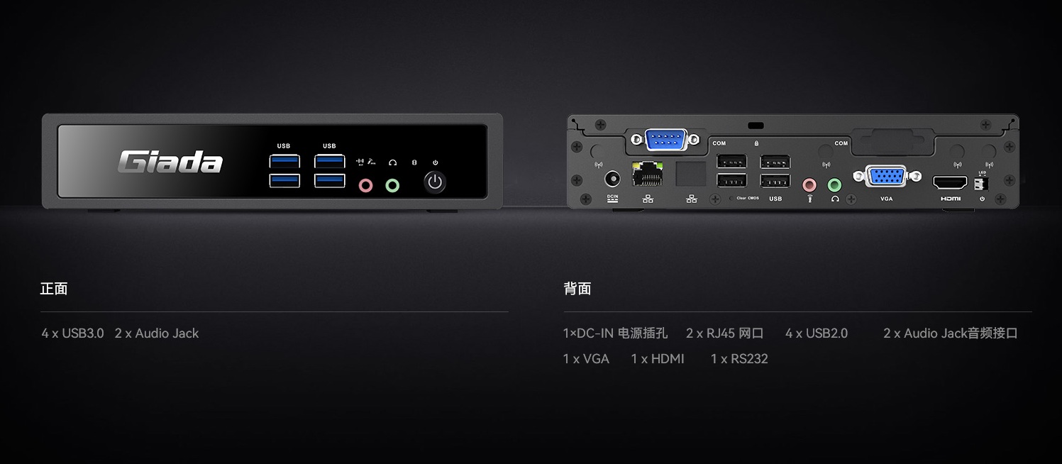ca88云终端BW612机身背面配备四个USB2.0接口,两个3.5mm 音频接口,两个千兆网线接口,一个VGA和 HDMI 接口,兼容几乎全部主流外设,满足云终端全场景接口使用需求,同时正面配备两个3.5mm音频接口,四个USB3.0接口,满足即插即用的设备需求。