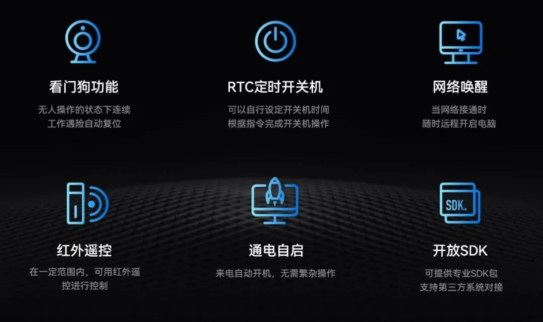 ca88主板IB3-771配置了无人值守专利技术,大力降低因高算力带来的能源消耗,该技术通过定时开关机、看门狗计时器、RTC宕机自检、红外遥控和局域网唤醒等功能实现主板绿色运行。