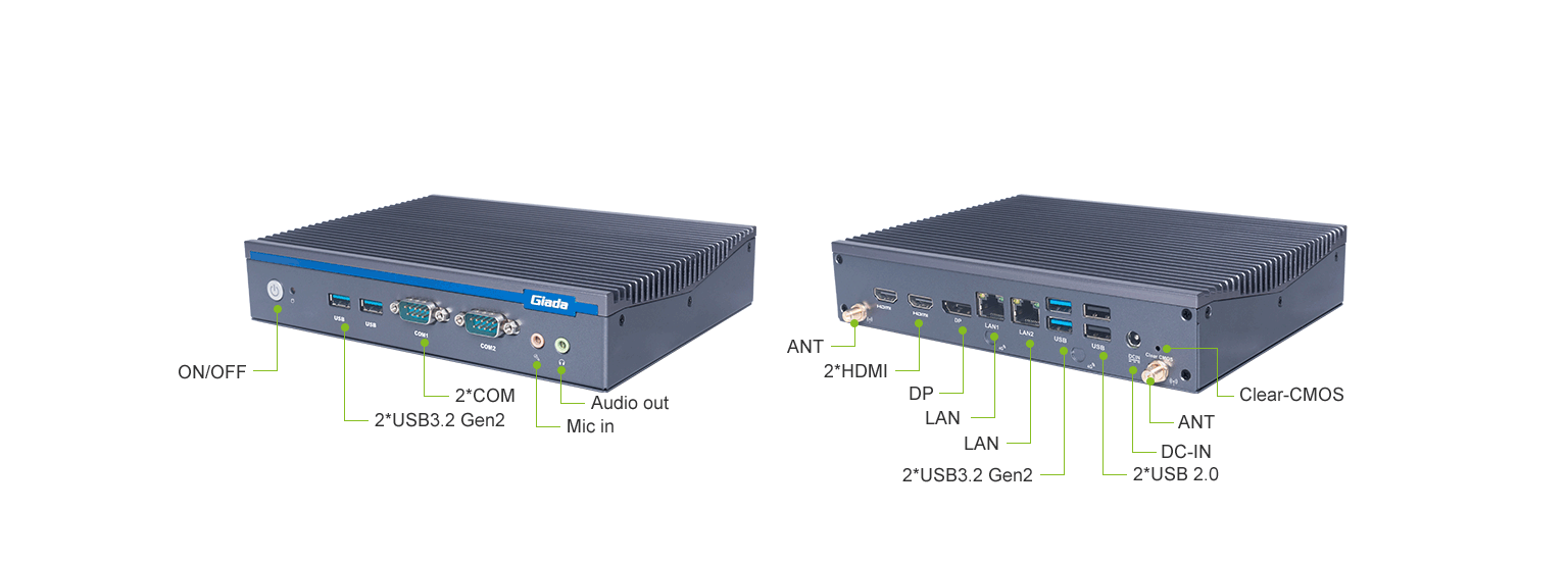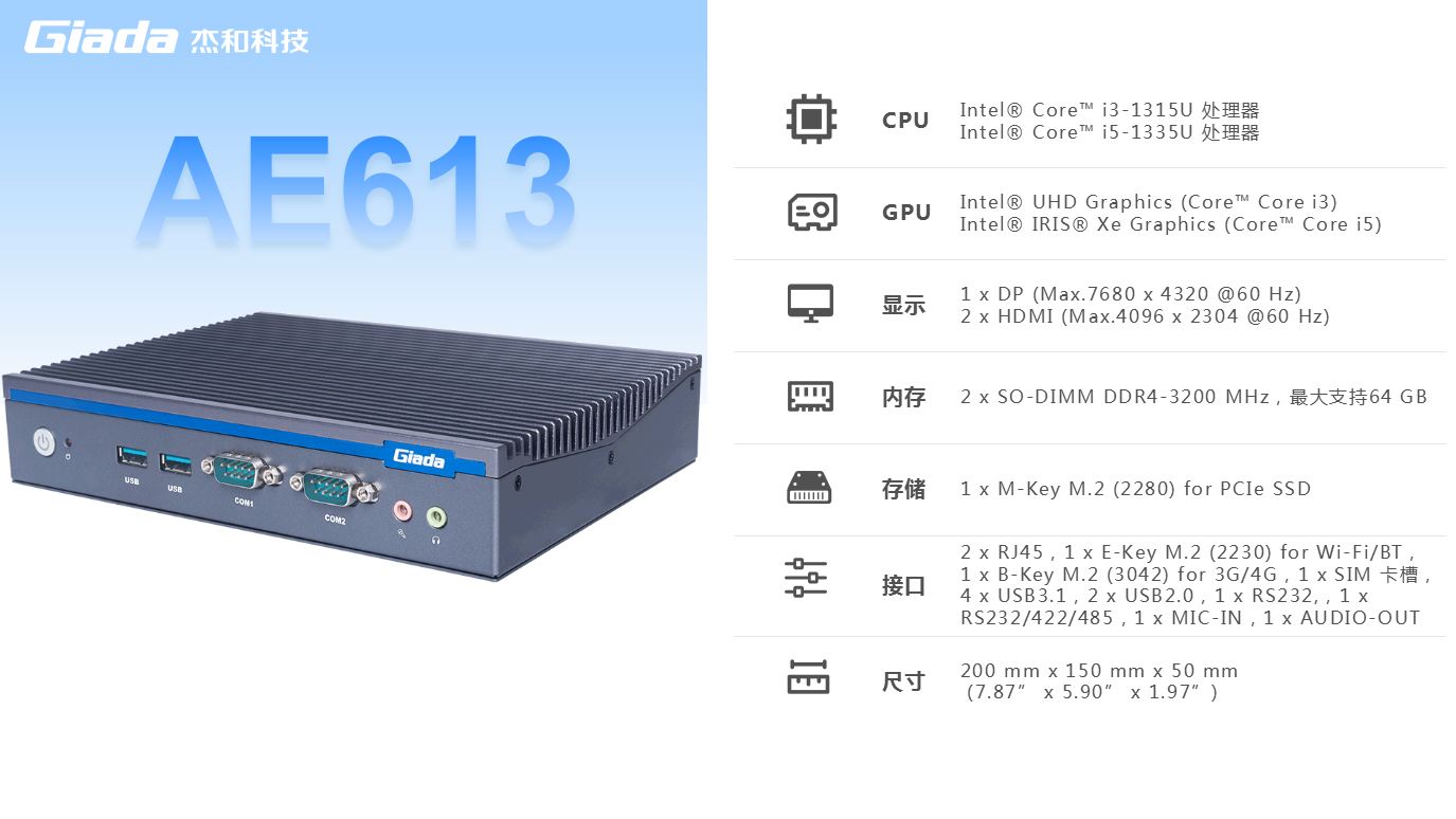 ca88科技AE613支持Windows 11 (64bit) /Linux Ubuntu (64bit)系统,双千兆自适应RJ45网口,4 x USB3.1 (10 Gbps),2 x USB2.0,1 x RS232,,1 x RS232/422/485,1 x MIC-IN,1 x AUDIO-OUT,丰富的I/O功能接口,实现更多功能扩展。