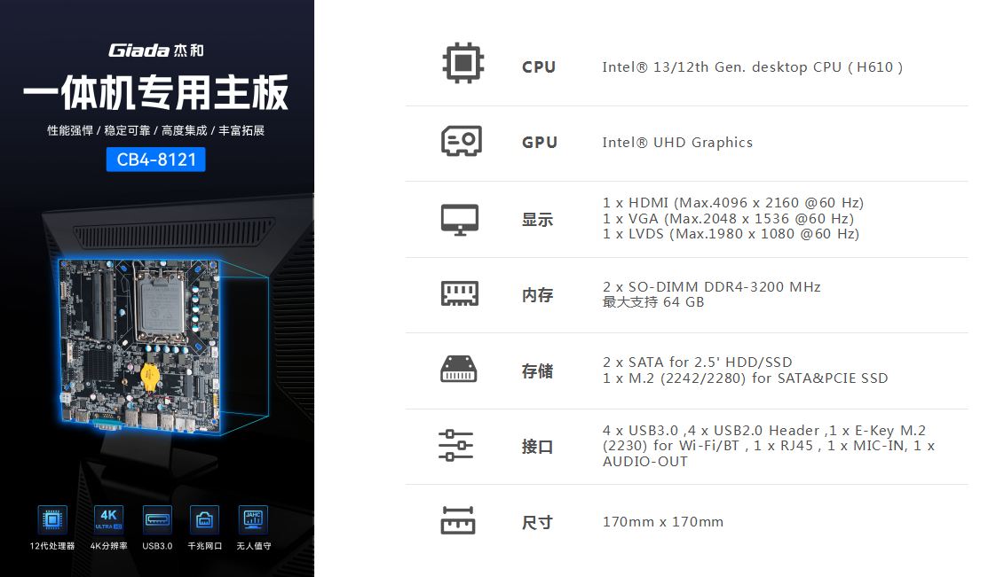 一体机在使用体验方面也有独特的优势:比笔记本屏幕大,比台式机更简洁,也解决了一直为人诟病的台式机线缆多而杂的问题,另外,随着计算机硬件和制造工艺的不断发展,一体机的性能也在不断提高,因此,越来越多的教育办公、日常娱乐和学习的用户选择使用一体机。Giadaca88科技根据市场与客户需求,推出这款高性能的一体机专研主板CB4-8121,带来全新震撼体验。