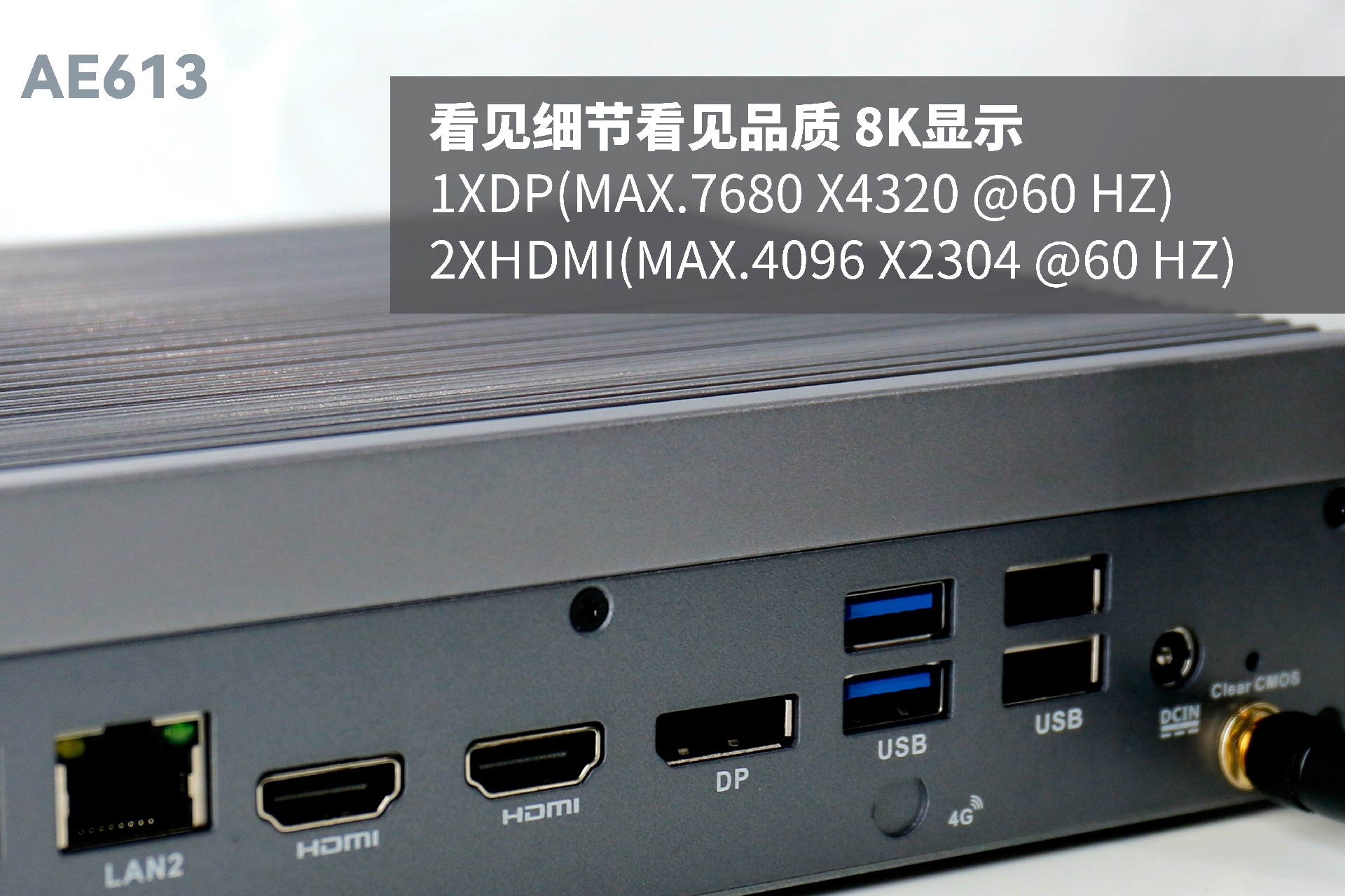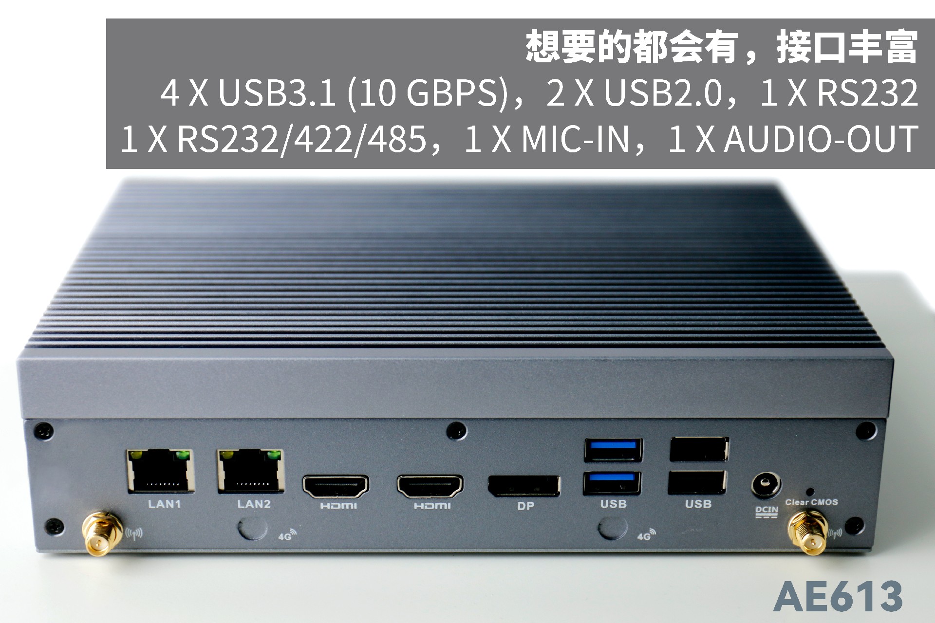 ca88AE613支持Windows 11 、Linux Ubuntu系统;拥有丰富接口:双千兆自适应RJ45网口,4 x USB3.1 (10 Gbps),2 x USB2.0,1 x RS232,1 x RS232/422/485,1 x MIC-IN,1 x AUDIO-OUT,帮助用户实现更多功能扩展;并且支持Wi-Fi 6E,可以提供更高的带宽和更少的干扰,支持对无线网络有特定需求场景的应用。
