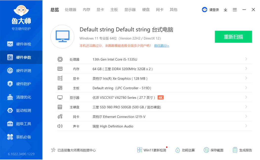 上面是鲁大师识别的ca88AE613硬件参数详情,ca88进行跑分测试的核心三大件选择的是13th Gen Intel(R) Core(TM) i5-1335U @1.30GHz处理器,Intel(R) Iris(R) Xe Graphics显卡,三星 32GB*2 DDR4 3200MHz内存,三星SSD 980 PRO 500GB(500 GB/固志硬盘),下面ca88来看详细的跑分数据。