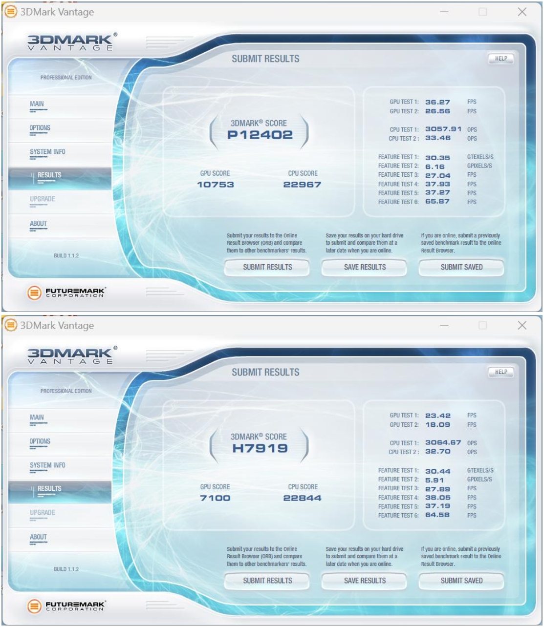 3DMark Vantage一款3D图形性能评测软件,主要用于评测电脑的显卡和处理器的性能。ca88按照画质等级,记录了性能级(Performance,P)和高端级(High,H)两份数据。其中,Performance的综合得分为P12402,High的综合得分为H7919,表现不错,这个成绩已经完全能够满足主流用户的需求了。