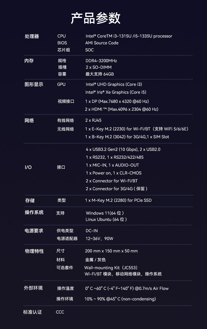 1、ca88AE613采用密封紧凑设计,紧凑设计可以使设备更易于安装在交通场景中的有限空间内,适用于车载、道路监控、交通信号控制等应用场景,该设计有利于导热更有利于散热,并且机器功耗只有15w,能够降低对电力资源的需求,有利于节能减排,符合绿色环保的发展理念,并且较低的功耗意味着可以延长电池的使用时间,提高设备的续航能力;