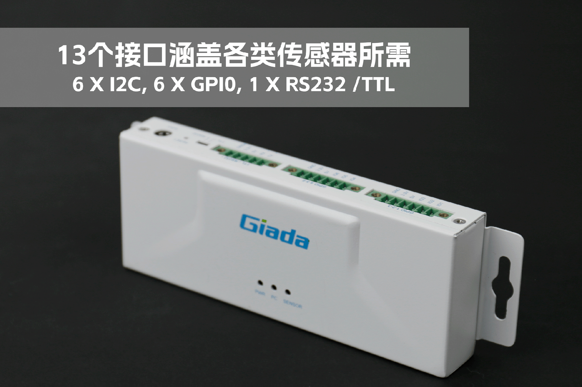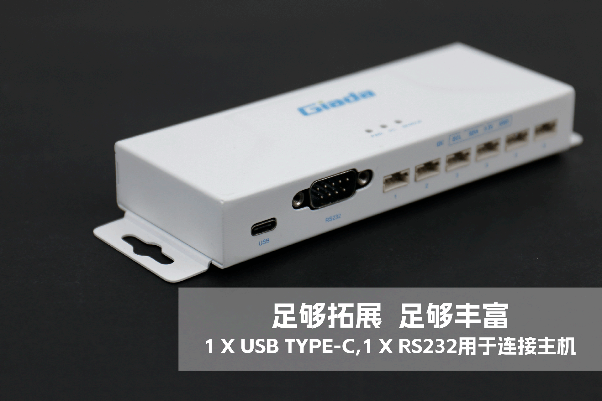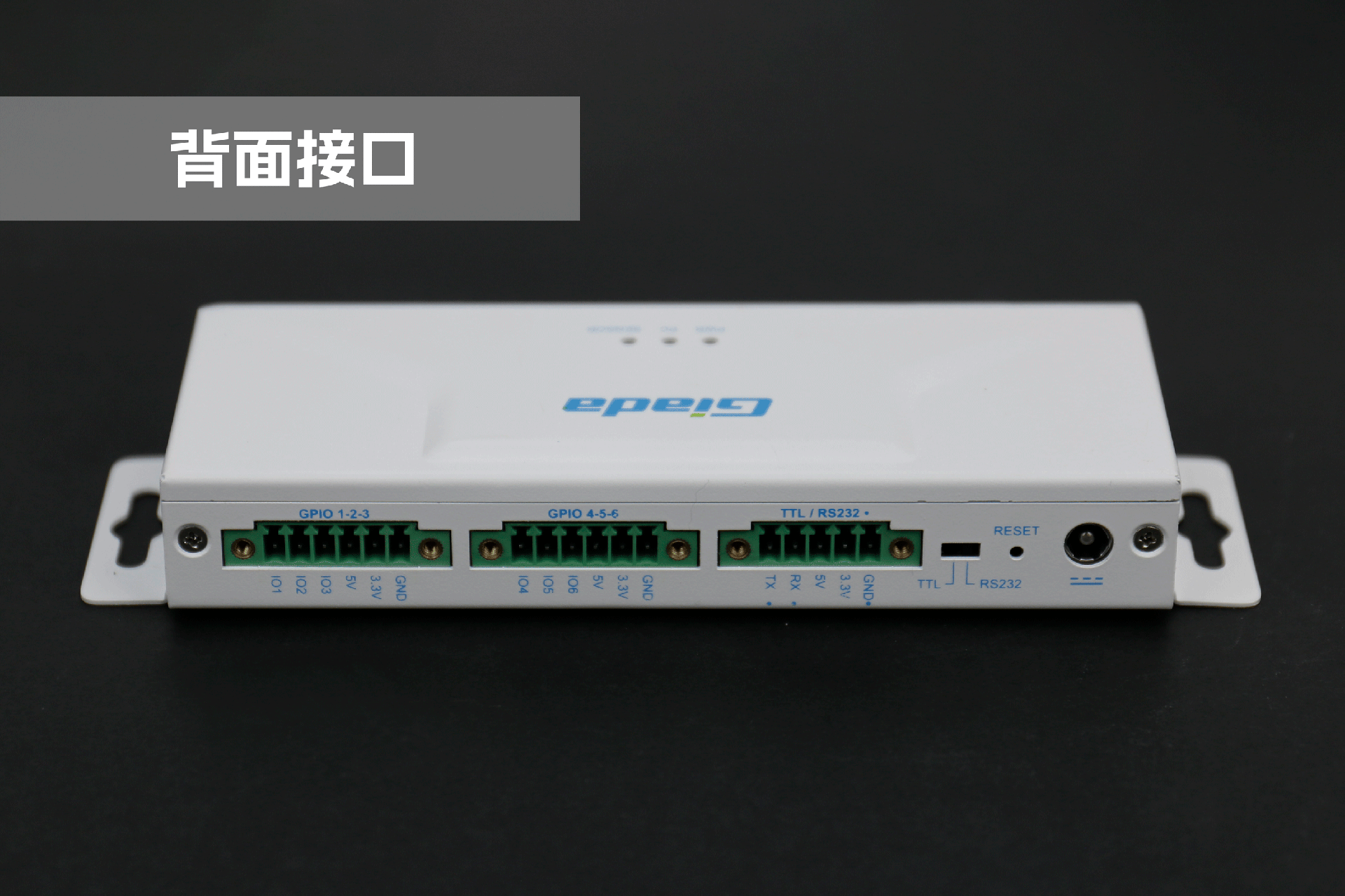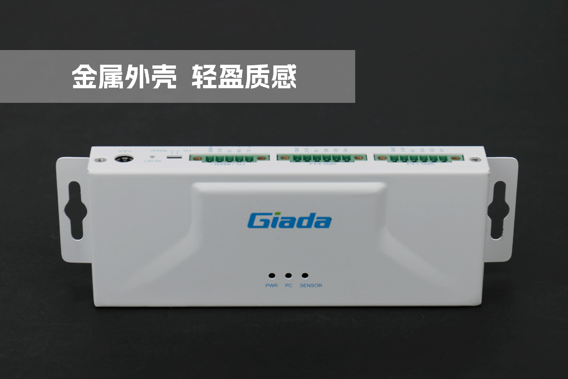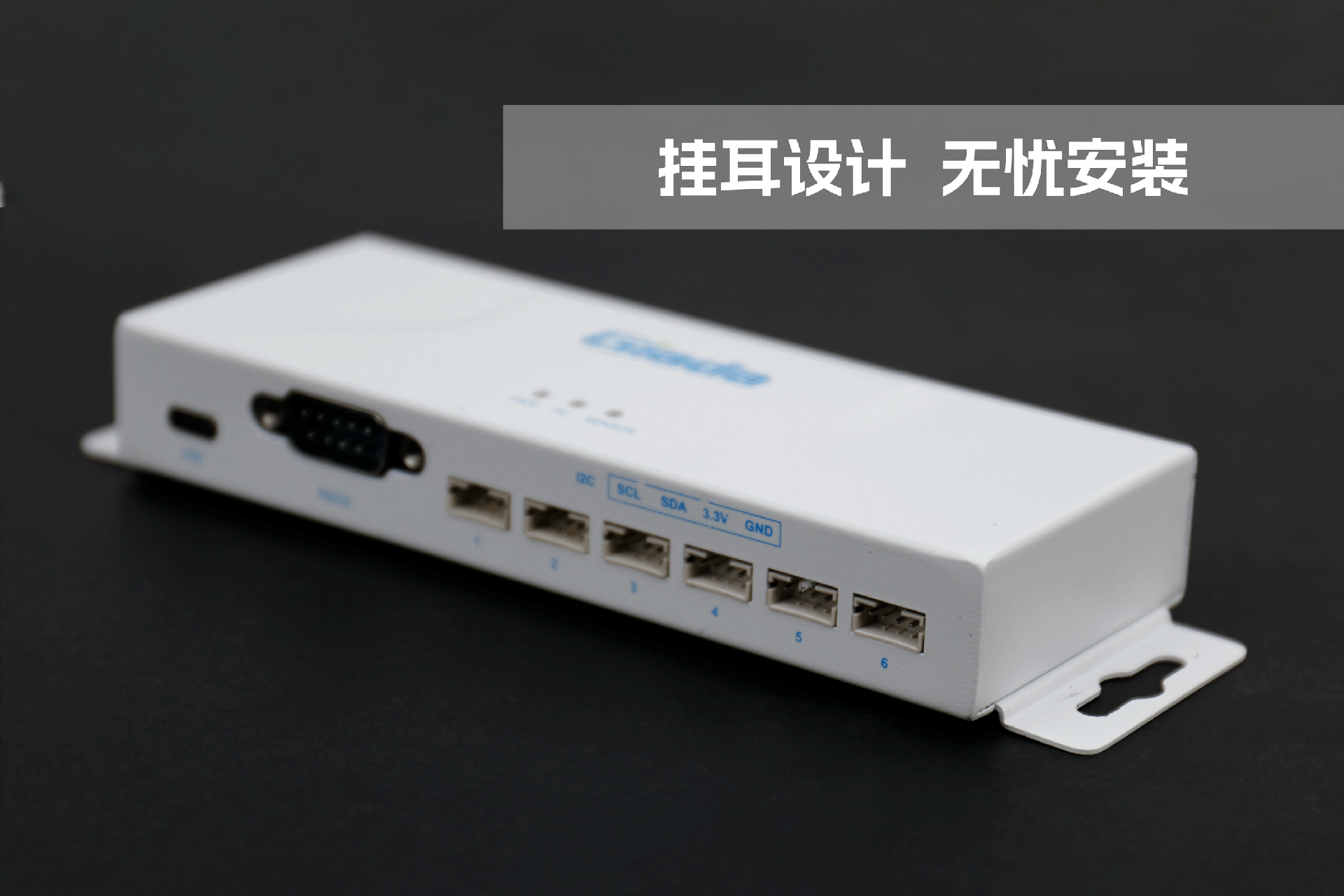 ca88物联网拓展坞RD01外部为白色,顶部印制ca88Giada的彩色logo,外壳采用金属材质,左右两侧设计同材质挂耳,可以方便用户固定设备。