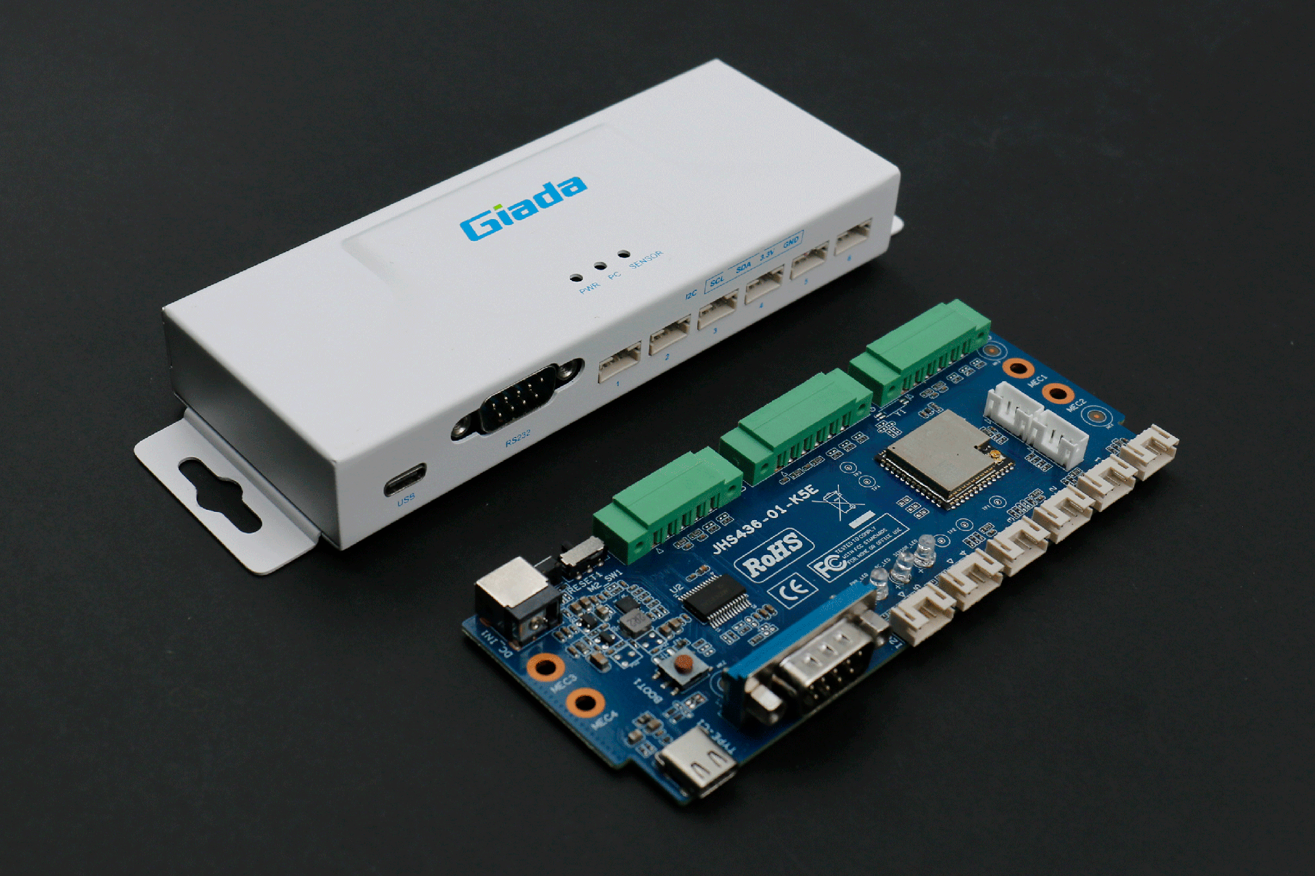 ca88RD01接口丰富,正面配备1个USB Type-C,用来与媒体播放器通信(USB串口)和供电;1个RS232 串口,采用 DB9 端子,支持 DTS 和 CTS 信号,可用来与媒体播放器通信;6个I2C接口,采用6组HY2.0-4PIN端子,用于与传感器通信。在顶部设置3个LED 灯,用于状态指示,LED1通电显示蓝色,LED2与媒体播放器通讯闪烁绿色,LED3与传感器通讯闪烁绿色。